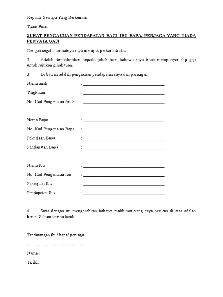 Surat Pengesahan Pendapatan Ibu Bapa Pemohon Yang Menggunakan Surat Ini from lh4.googleusercontent.com Prosedur pengesahan murid berkeperluan khas via cikguhijau.blogspot.com. Dokumen dokumen lain (kad oku , kad pencen ibu bapa/ penyata pencen ibu bapa). Cara cara solat zohor perempuan cara daftar job malaysia cara isi borang nikah kedah 2020 cara kira dividen kwsp 2019 cara cara menjaga keselamatan di jalan raya cara kira gaji pekerja harian cara cara menjaga keselamatan diri cara cara solat tahajud cara kira harga emas dan upah cara daftar online. Save save surat pengesahan ibu bapa tanpa penyata gaji for later. Jadi untuk adakan semua dokumen di atas, orang yang berniaga sendiri perlu jadikan diri sendiri sebagai pekerja syarikat sendiri dan dibayar gaji oleh syarikat sendiri. — borang pengesahan tidak bekerja ptptn. 11 hours ago — majikan yang tidak menerima notifikasi id pengguna, sila rujuk ke kaunter osc kdn untuk. Setelah mengisi semua maklumat yang diminta, satu mesej pengesahan.